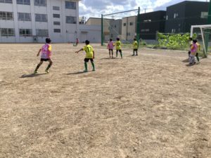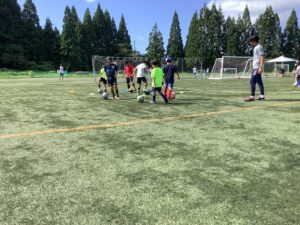 校庭というすばらしいグランドでは、U-11が新たなシステムに挑戦しました。この取組みは、春先から計画をしていたのですが、試合の流れによってその場面、局面に対応できるようにすることや、選手たちそれぞれの個性や能力によって、最適なものを探求する意味もありました。また、試合経験の少ない選手にもたくさんの経験を積んでもらうため、多くの試合に出場してもらいました。だいぶ試合にも慣れて、球際もしっかりと対応できるようになってきています。