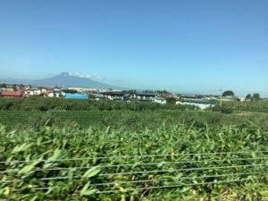 ※写真は、弘前のりんご畑と岩木山。天候に恵まれた早朝、秋田をニ台のクラブバスで出発。運転をお願いした小島さんと北之口コーチ、そして私が引率でしたが、黄金色の稲穂とりんご畑の風景は、青空とマッチして快適な旅となりました。青森FCの伊藤監督からの連絡で、試合会場は青森市立小柳小学校校庭の中に、2面のピッチをつくって行うとのことでした。そんなに広い校庭なのかと心配しながら到着すると、校舎は真新しく、隣接している校庭は、小学生用のピッチ2面は十分すぎる広さに、まずびっくりさせられました。校庭というよりは、グランドといった方が適切な表現の規模でした。