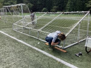 さて、実は、今日の木曜日は、「軽量アルミ製サッカーゴール」と「両面使えるサッカーゴール」の修理作業を行うことになっていたので、時間があれば飛ばされた休憩施設も解体して、建て直したいと思っています。現場行って、できるだけ原形を崩さないようにできないか考えてみます。ちなみに、「軽量アルミ性サッカーゴール」は小年用サイズで4組(8ゴール)あり、軽量のため、移動が容易で重宝しています。また、「両面使えるサッカーゴール」も4組(8ゴール)あり、これも少年用サイズでスモールゲームには威力を発揮してくれています。