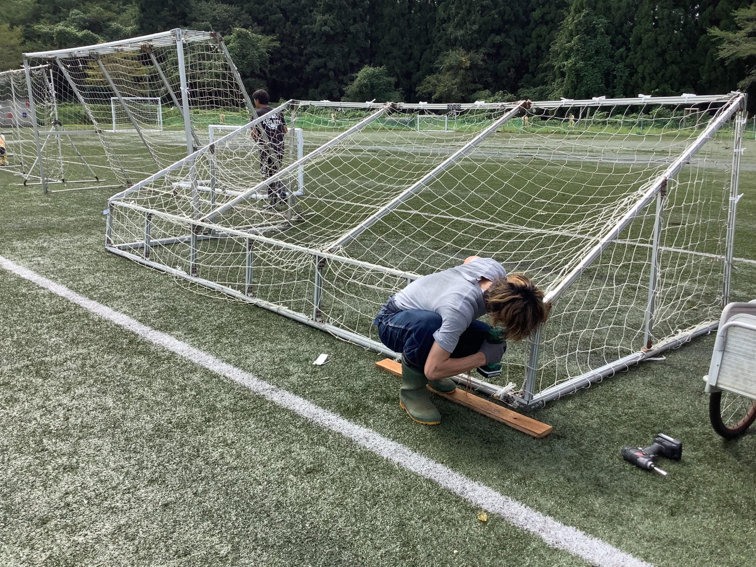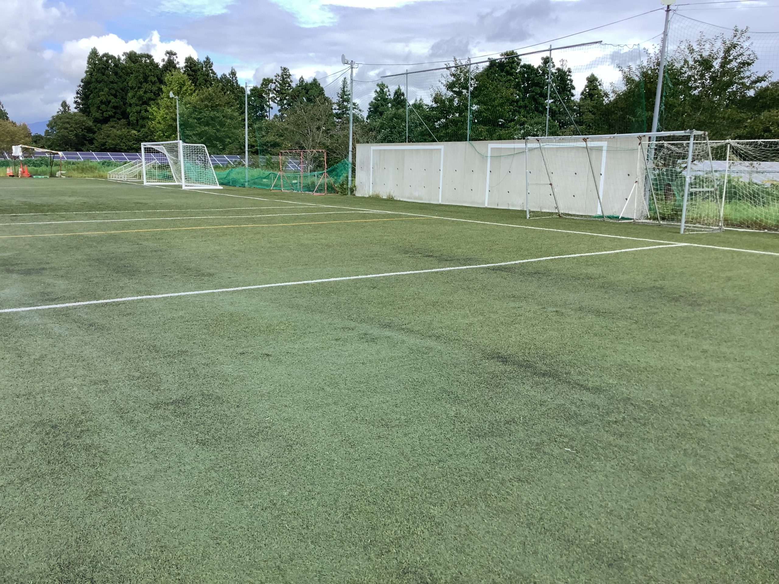 ※いつまでも新しい感じの人工芝とシュート盤。よくスポルティフタウンに試合に来る人たちから、「ここ(スポルティフタウン)の人工芝はいつも新しいように見えて、劣化がないですね」と言われますが、それにはいくつかの回答をしております。まず、小・中学生が主に使用しているため負荷が少ないのではないか。次に、土を整地してその上に人工芝を敷いたため、ほどほどの水分が地面から得られるため糸が劣化しないのではないか。ということは、舗装の上に人工芝を敷くと、夏の暑さで舗装と人工芝の間が高温になるため、お金を掛けてつくった人工芝グランドは、高温で糸が焼けてしまうのではないかと私は思っています。最後は、冬期間は積雪で使用できない雪国にあるため、使用期間が短いこともその要因と考えています。ここ数年は、自分たちで補修や手入れをしています。補修の仕方のノウハウも持っていますので、この秋と来春の雪解け頃に補修作業を予定しております。