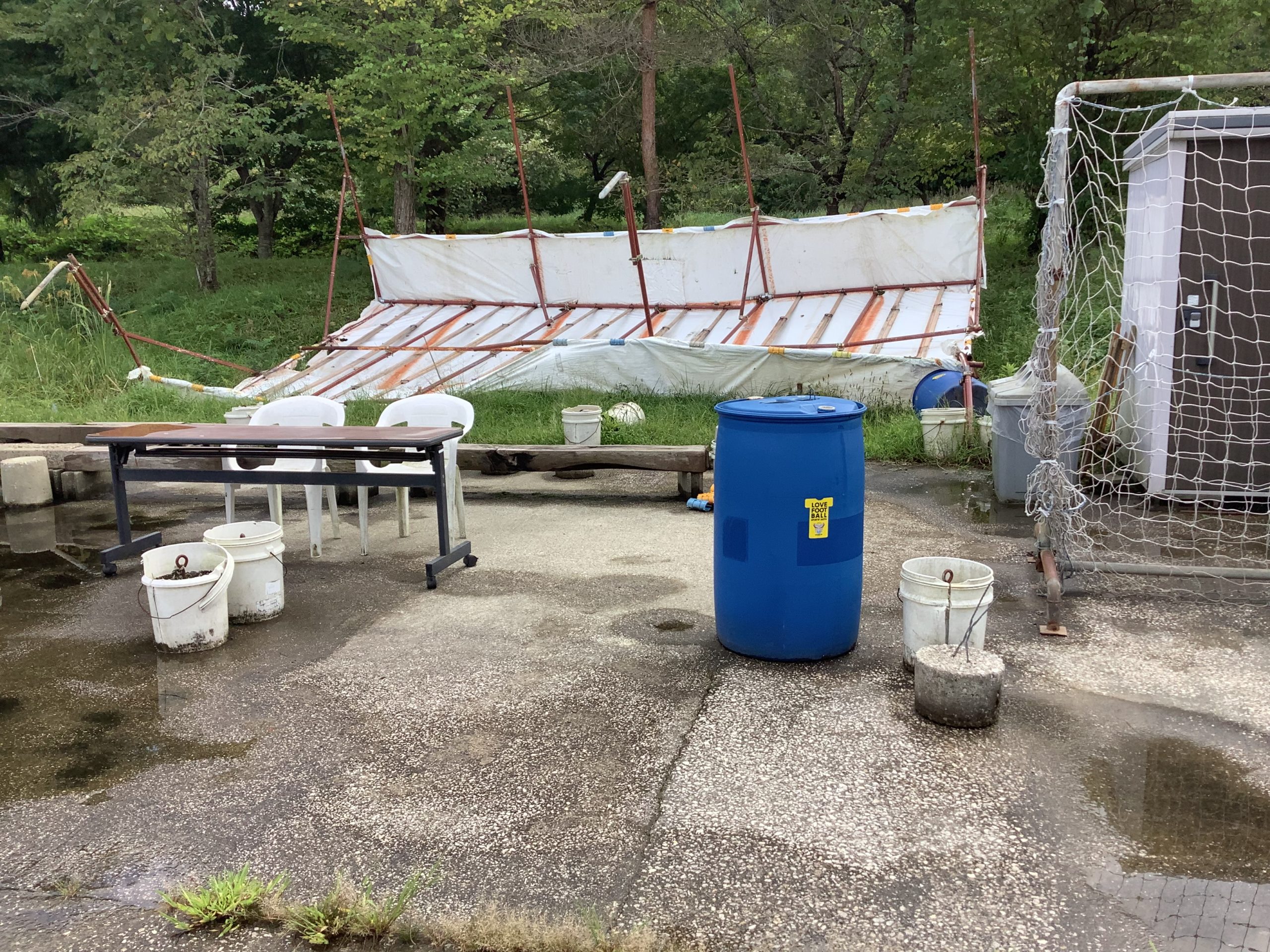 ※秋の嵐で、飛んでしまった選手休憩施設。この日は、「水曜キッズサッカー楽校U-12」だけは予定どおり行うことになっていたため、担当の佐藤重幸コーチが会場のピッチコンディションを見るために早めにスポルティフタウンに行ったのですが、そこで風に飛ばされた休憩施設に遭遇したのでした。