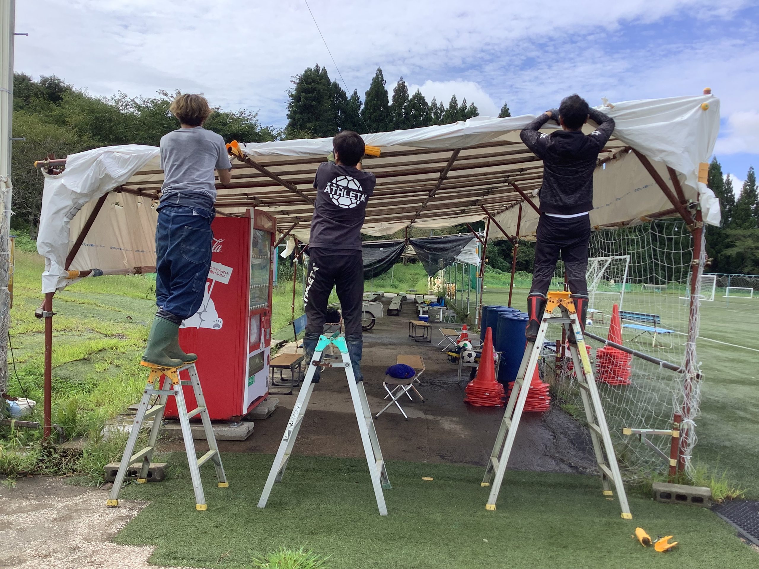 この日は、「水曜キッズサッカー楽校U-12」だけは予定どおり行うことになっていたため、担当の佐藤重幸コーチが会場のピッチコンディションを見るために早めにスポルティフタウンに行ったのですが、そこで風に飛ばされた休憩施設に遭遇したのでした。