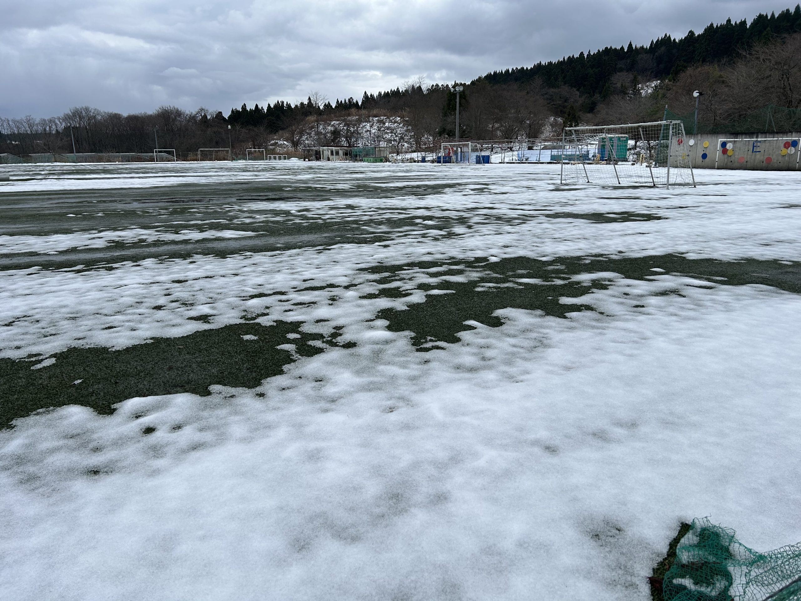 ※今朝••雪の積もったスポルティフタウン。今日は、午前中にU-13が県立中央公園人工芝グランドで、ヴェルディ岩手U-13とトレーニングマッチを行う予定でしたが、こちらも残念ながら積雪のため中止にせざるを得ませんでした。秋田市内の平地の積雪は0に限りなく近い状況なのですが、スポルティフタウンと県立中央公園の標高は少し高いため、平地と比べても積雪が多く、毎年、春の訪れが遅くなっています。おそらく今後は、平日はもちろん、週末、冬休みもスポルティフタウンでの練習は難しくなりそうです。ここ数日の練習も、すべて人工芝室内練習場のお世話になっています。火曜日からは、完全冬季練習体制に入り、練習日や送迎バス運行が冬季バージョンに移行します。