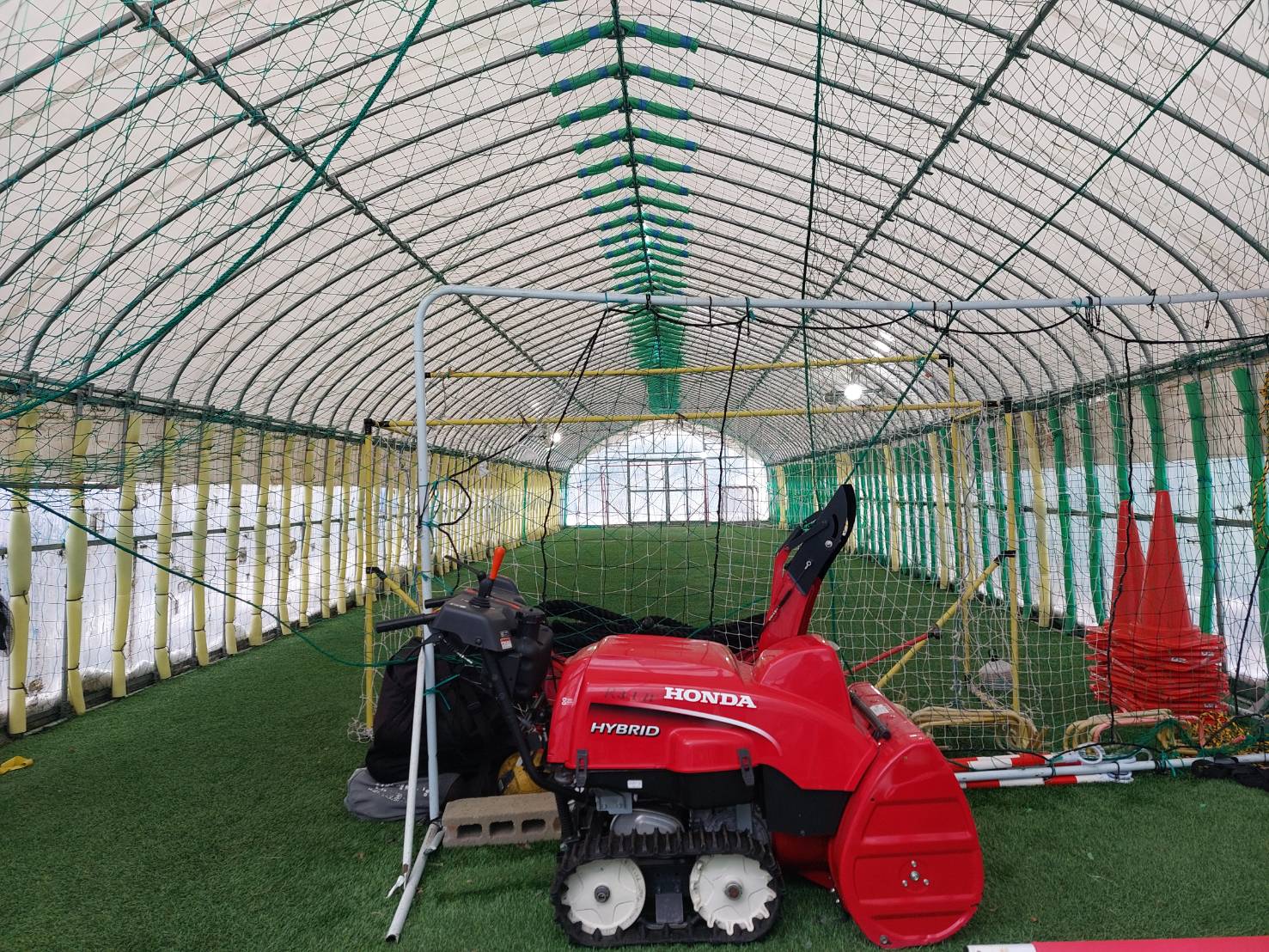※第一、第二人工芝室内練習場に設置されている大型ジェットストーブ。昨日の金曜日は、午後から雪が強く降ってきて、それに加えて、夕方からは気温も急降下。路面凍結により、あちこちで車の渋滞が起きていましした。クラブの選手送迎バスも15分~20分ほどの遅れが生じて、それに伴い、人工芝室内練習場での練習開始も遅れて始まりました。人工芝室内練習場内も寒々としていたため、二棟にそれぞれ設置している大型ジェットストーブに今季初めての点火となりました。室内が暖まるに従って、人工芝室内練習場の屋根に積った雪も同時に落ちてくれます。その落ちた雪が、人工芝室内練習場を風から守ったり、保温の役割も果たしてくれます。今後、積雪が多くなると、第二人工芝室内練習場内に格納している「HONDA ハイブリット除雪機」の活躍となります。この除雪機は、令和3年に購入したもので、強力パワーで、狭い場所も除雪できる優れものです。これからお世話になります。