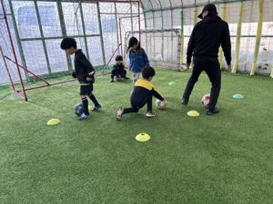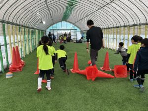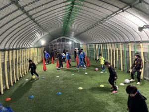 午前中は、「週末キッズサッカースクールU-10」と佐藤智コーチが担当しての「クラブのU-11」が第1、第2スポルティフドーム(人工芝室内練習場)に分かれて同時スタート。「週末キッズサッカースクールU-10」は、20人ほどの参加で、小松コーチが初心者を対象にトレーニングをしてくれました。ボールタッチや1対1など楽しく遊びの要素も入れて時間を過ごしました。最後は初心者のスクール生も3on3のゲームに入り大活躍してくれていました。